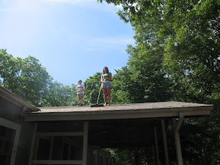 In the morning it was more clean-up. Here’s our neighbor Sean and Lydia, a new counselor, sweeping off the roof of the main cabin. We’re thorough!
