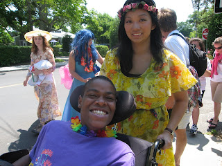 What an exciting day this is for all of us here at Camp Jabberwocky ’07. The campers arrived on the 11:30am ferry after saying good-bye to their family and friends in Wood’s Hole. “Don’t worry,” we told their parents. “we won’t lose them!” Here’s the counselors waiting for the campers at the ferry dock in Vineyardhaven. They are dressed in costumes: