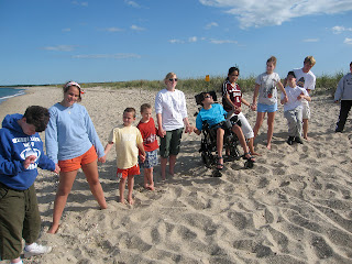 After lunch we had a long rest and then bundled up for an afternoon beach trip.  We arrived around 4pm and commenced a rousing game of “Red Rover” during which many feet got run over by wheelchairs and a lot of sand was consumed.  Here’s some pictures from that heated match:
