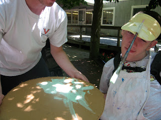 We woke up today and realized that the July 4th parade is only two days away. Oh my! So we all spent the morning painting various items for the big day. Many of us painted more than just the things we were supposed to paint and we spent a lot of time washing that off as well. Here’s some pics of the artists at work: