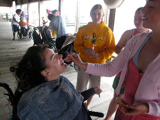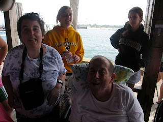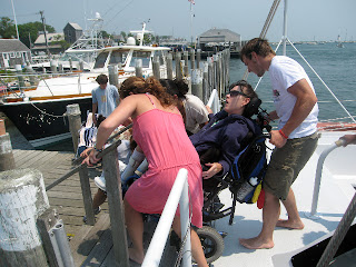 The breeze was quite strong so we cruised along at a healthy clip and sang pirate songs. We considered attacking some of the other vessels out there and plundering their loot, but this didn’t seem like a practical plan since we’d left most of our wheelchairs back on shore. We wondered: what if someone stole them? We’d have been up the creek then! Luckily that didn’t happen. Melissa P. brought her wheelchair along with her so she didn’t have to worry about theft. She was very calm as we unloaded off the boat. She told us to be careful of sea-legs.