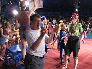 We took quick showers and took off for Circus Smirkus and even got there early. (Will wonders never cease) We enjoyed the show and our dinner there. After the show, they asked who would like to join the circus and Kirk and Fogey raised their hands. Maybe next year.
