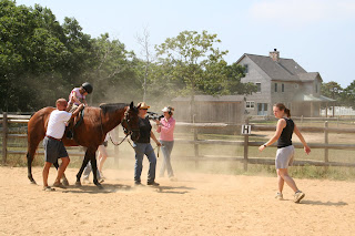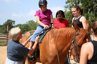 A group of campers went horseback riding. While waiting, they practiced their grooming skills. Their horse grooming skills, that is.