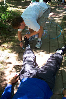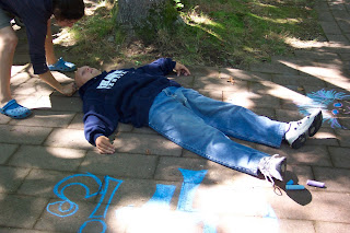 Afterwards, the campus looked like a scene from a bad murder/mystery movie. (Body shapes all along the paths, some looking quite festive with grass skirts and other details added.)