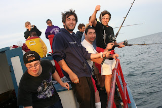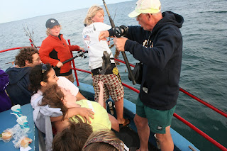 This evening many of the campers and folk went on one of the summer favorites – The Skipper! This year, in addition to catching the usual skum ? skimp ? scup ? (small fish), Adam and Athena each snagged a shark !!!!!! Since the blogger is VERY frightened of that particular species, it was a good thing she was not on the boat. Everyone enjoyed the picnic on board and the beautiful sunset.