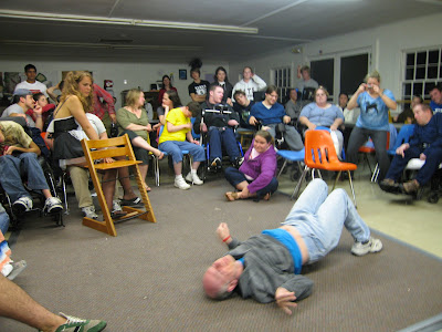 And after dinner we gathered around and had our first official “Challenge Night”. This means people challenge each other to things such as this “chubby bunny” contest…it involves stuffing marshmellows in your mouth and saying “chubby bunny”.