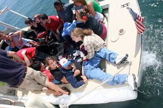This morning we sailed on the Alabama. We had to take a launch out and hoist folks up a rope ladder. Wheelchairs too. It took an hour. Since we only had the boat booked for 2 hours, we were a little worried that we would have to just start unloading and never get to sail. But, the captain extended our time. Guess he didn’t want a mutiny. We only lost one shoe, which Ben retrieved before it sank. Good job Ben.