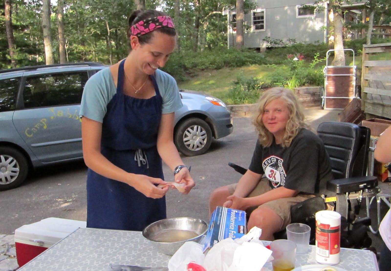 Annie helped Adam and Moriah prepare and cook their fish.