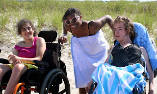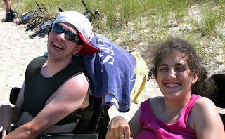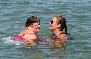 Chris helps John get into the water.