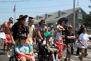 After play practice and before the beach, we squeezed in a parade. Along with the Oak Bluffs Polar Bear Club, we greeted Made in the Shade at the ferry, and marched with them up Circuit Ave to the Tabernacle. We dressed up for the occasion.