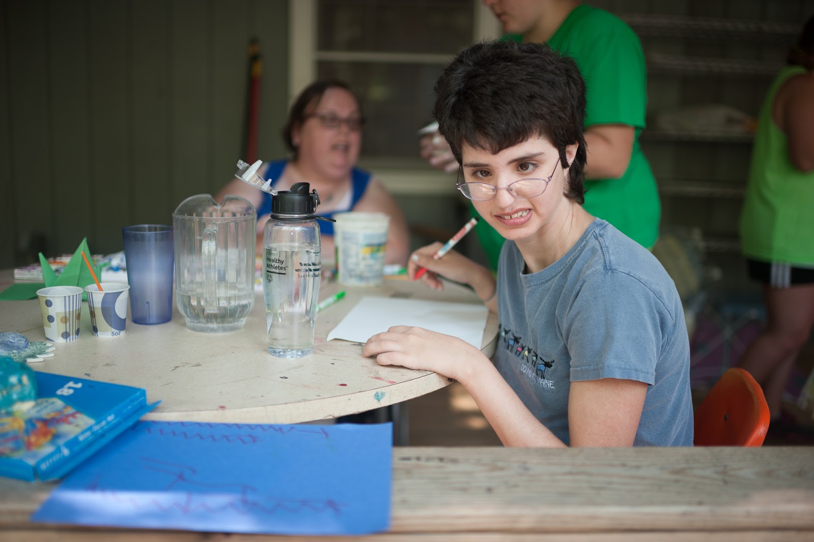 On the porch of the art cabin, Emily was drawing pictures to decorate the walls of Galumphing.